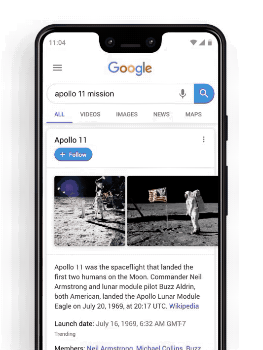 In collaboration between Google and the Smithsonian National Air and Space Museum, now you can also explore 20 new visual stories related to the lunar mission directly from Search. When you enter a space-related query—like “Apollo 11 mission”—on your mobile device, you’ll see visual stories from the Smithsonian about the mission, the spacecraft, and the people who made it possible. These full screen, tappable visual stories feature photos, videos and information about the space journey.